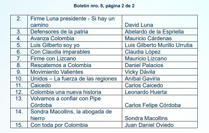 De los 22 grupos significativos de ciudadanos que presentaron un total de 28.582.935 firmas de apoyo ante la Registraduría Nacional del Estado Civil para respaldar la inscripción de candidaturas a las elecciones presidenciales, 15 cumplieron con el número mínimo de firmas válidas requeridas, 6 no cumplieron y uno se retiró de la contienda electoral (Héctor Olimpo Espinosa).