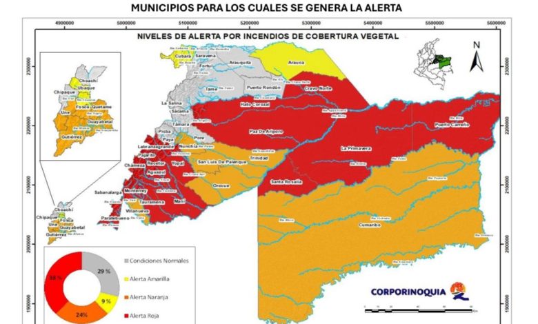 Dentro de la alerta roja, que abarca el 38% de la región, se encuentran los municipios de Aguazul, Chámeza, Hato Corozal, Maní, Monterrey, Paz de Ariporo, Recetor, Sabanalarga, Tauramena y Yopal en Casanare; Cravo Norte en Arauca; La Primavera, Puerto Carreño y Santa Rosalía en Vichada; Paratebueno en Cundinamarca, junto a Labranzagrande y Pajarito en el departamento de Boyacá.