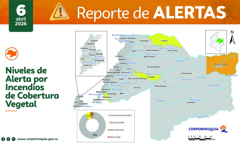 De acuerdo con el más reciente reporte de alertas, emitido por el IDEAM, la jurisdicción de Corporinoquia presenta un incremento en las condiciones de riesgo asociadas principalmente a deslizamientos de tierra y eventos hidrológicos, mientras que la amenaza por incendios de cobertura vegetal se mantiene en menor proporción.