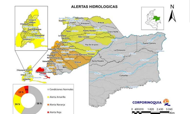 La alerta amarilla alcanza el 18% del territorio, en municipios de Casanare como Hato Corozal, Paz de Ariporo, Recetor y Tauramena; en Arauca, Fortul y Tame; y en Cundinamarca, Gutiérrez y Quetame.