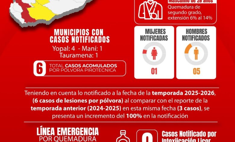 La Secretaría de Salud de Casanare informa a la comunidad que, en el marco del Período de Vigilancia Intensificada de lesiones por pólvora pirotécnica e intoxicaciones por fósforo blanco y licor adulterado con metanol 2025–2026, Casanare, (01 de diciembre 2024 al 17 de enero 2026) se realiza seguimiento permanente a la notificación de estos eventos en el departamento, con el fin de orientar acciones de prevención y atención oportuna en salud.