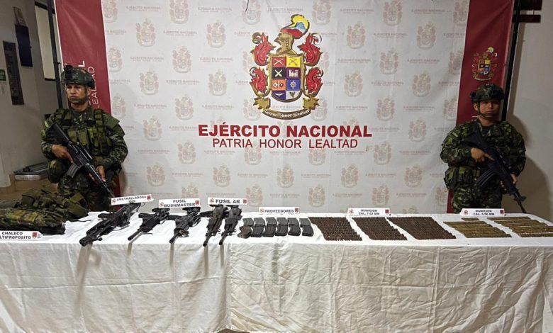Durante la acción, se hallaron 2 fusiles Galil, 2 fusiles Bushmaster, una ametralladora M-60, 12 proveedores, más de 900 cartuchos de diferentes calibres y 2 chalecos multipropósito, material que sería utilizado para el desarrollo de acciones delictivas en la región.