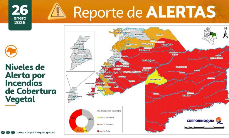Con base al reciente reporte emitido  por el Instituto de Hidrología, Meteorología y Estudios Ambientales, en la jurisdicción de Corporinoquia se presenta un aumento considerable en alerta roja por cobertura vegetal, lo que implica la necesidad de tomar acciones inmediatas por parte de los sistemas de prevención como atención de emergencias y cuerpos de socorro, especialmente en municipios de Casanare como Yopal, Aguazul, Recetor, Monterrey, Maní, Aguazul, Orocue, San Luis de Palenque, Nunchía, Hato Corozal y Trinidad, así como en Puerto Carreño, La Primavera y Cumaribo en el departamento de Vichada.