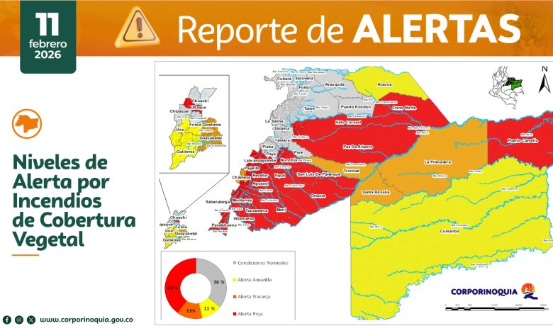 De acuerdo con el más reciente reporte emitido por el Instituto de Hidrología, Meteorología y Estudios Ambientales, IDEAM, la jurisdicción de Corporinoquia registra un aumento crítico en las alertas por incendios de cobertura vegetal, con una concentración predominante en la alerta roja.