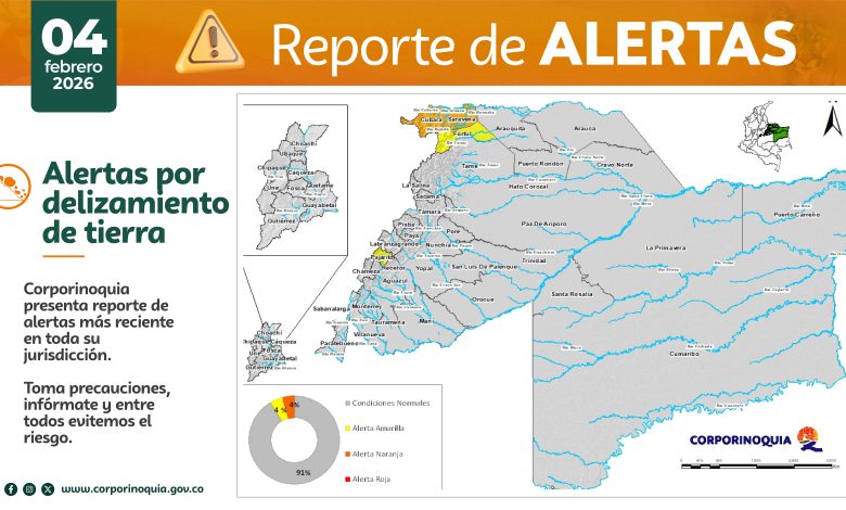En cuanto a la amenaza por deslizamientos de tierra, el reporte indica que el 4% del territorio se encuentra en alerta amarilla, con incidencia en Fortul, en el departamento de Arauca, y Pajarito, en el departamento de Boyacá. De manera simultánea, un 4% del territorio se mantiene en alerta naranja, concentrado en los municipios de Cubará, en el departamento de Boyacá, y Saravena, en el departamento de Arauca.