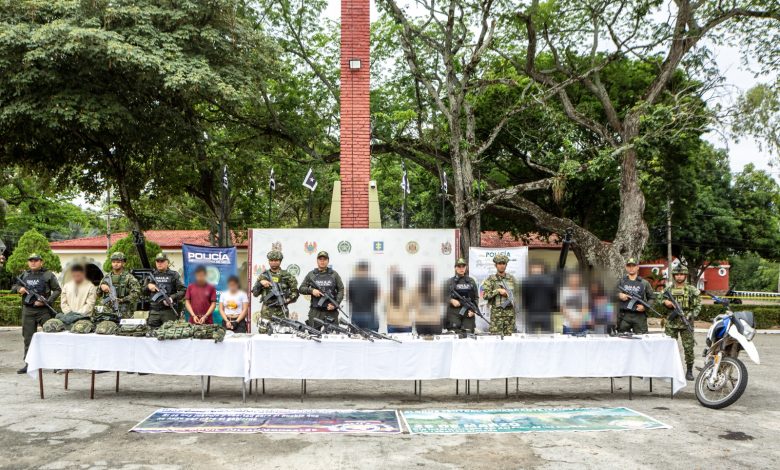 En el lugar se incautaron cinco armas largas, seis armas cortas, una granada de fragmentación, un artefacto explosivo improvisado, dos granadas de aturdimiento, munición, proveedores, chalecos, equipos de radiocomunicación, binoculares, pancartas alusivas al grupo armado ilegal.