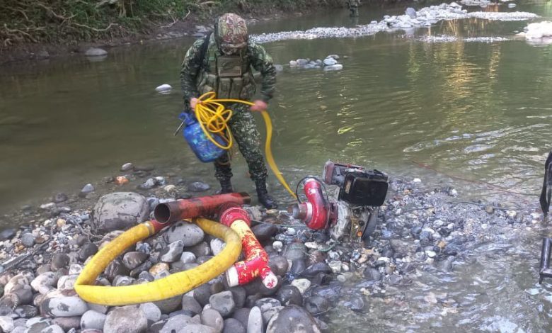 Durante la intervención, en zona rural sobre el río Purnio, las tropas hallaron tres dragas utilizadas para la extracción de material bajo el nivel del agua, cuatro motores, dos granadas de filtro bomba de agua, tres mallas eslabonadas y demás elementos empleados en la explotación ilícita de yacimientos mineros.