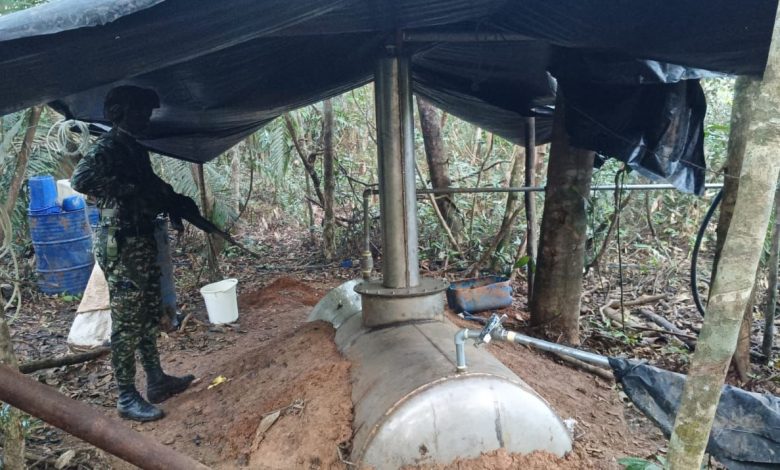 Las tropas también ubicaron equipos, maquinaria y elementos empleados en la actividad ilícita, entre los que se destacan prensas, un compresor, hornos microondas, plantas eléctricas, tanques de almacenamiento, sistemas improvisados de secado, herramientas, dispositivos USB, estampillas, bolsas, lonas, tubos galvanizados, lavadoras y cilindros de gas. Todo este material fue neutralizado y destruido conforme a los procedimientos técnicos establecidos por la institución.
