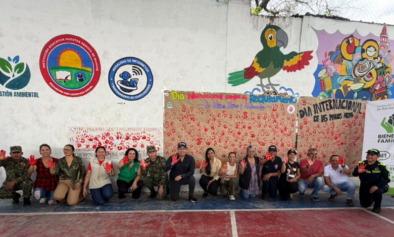 La actividad dio inicio con un acto protocolario donde se realizó intervención por parte de las diferentes entidades administrativas y de restablecimiento de derechos, seguidamente actividades lúdico – pedagógicas y posterior en el marco de la actividad interinstitucional los estudiantes y todos los presentes, estamparon sus huellas como símbolo de rechazo al reclutamiento forzado, la mencionada actividad se conto con el acampamiento de la Secretaria de Gobierno Municipal (profesional en víctimas, población vulnerable, enlace de infancia, SIP), Instituto Colombiano de Bienestar Familiar ICBF, Comisaria de Familia, Bomberos Municipal, Ejercito Nacional, Policía Comunitaria y SIJIN; por último se socializaron líneas de atención: 123 Policía Nacional, 122 Fiscalía, 155 Línea de Violencias y 141 ICBF, como mecanismos de apoyo y protección para la comunidad educativa.