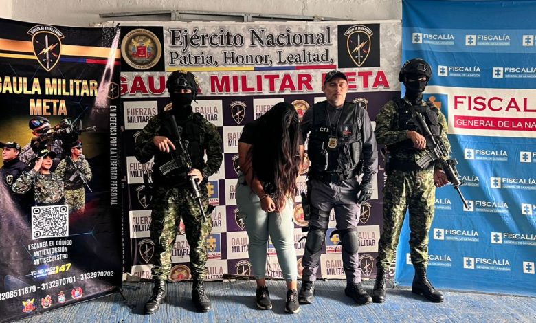 El operativo se llevó a cabo en el kilómetro 6 de la vía que conduce al municipio de Acacías, Meta, en inmediaciones de una empresa de plásticos, donde la mujer fue sorprendida en el momento en que presuntamente exigía a su víctima el pago de cinco millones de pesos. Según las investigaciones preliminares, la mujer se identificaba falsamente como integrante del GAO-r Bloque Jorge Suárez Briceño, bajo órdenes de alias Calarcá.