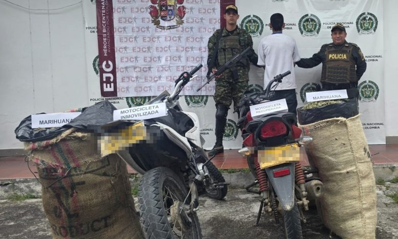 Durante el procedimiento se incautaron aproximadamente 47 kilogramos de marihuana, los cuales estaban distribuidos en dos lonas de color café. Así mismo, fueron inmovilizadas dos motocicletas; una de ellas, al ser verificada en los sistemas, figuraba como reportada por hurto, configurándose el presunto delito de receptación.