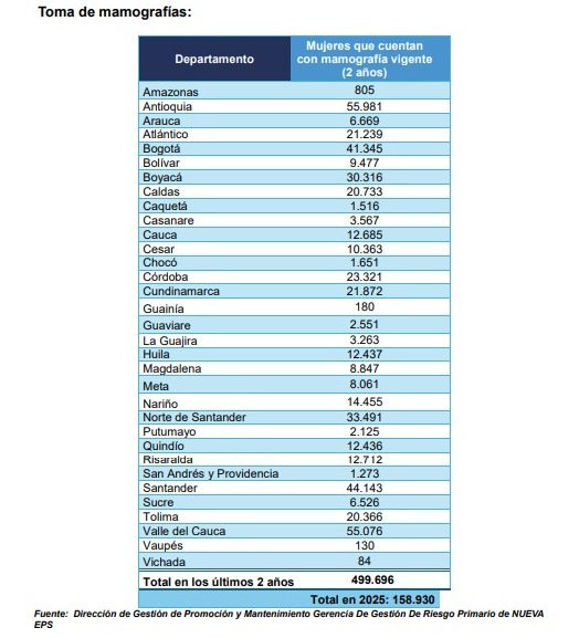 Por esta razón, durante los últimos 2 años, Nueva EPS ha realizado alrededor de 500.000 mamografías a sus afiliadas entre los 50 y 69 años de edad. También 205.148 mujeres entre los 40 a 69 años cuentan con examen clínico de mama en el año 2025 (es decir, observación especifica del seno en la consulta).