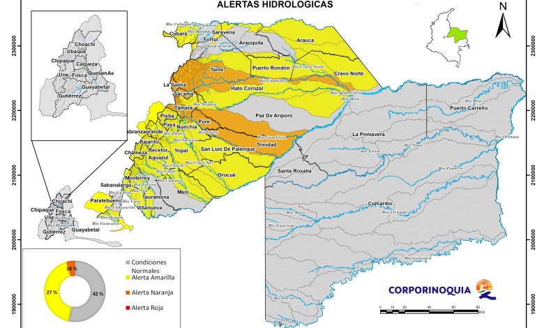 Se informa a las autoridades municipales, organismos de socorro y comunidad en general sobre el reporte de alertas hidrológicas y de deslizamiento emitido por el Instituto de Hidrología, Meteorología y Estudios Ambientales (IDEAM), correspondiente a la jurisdicción de Corporinoquia.