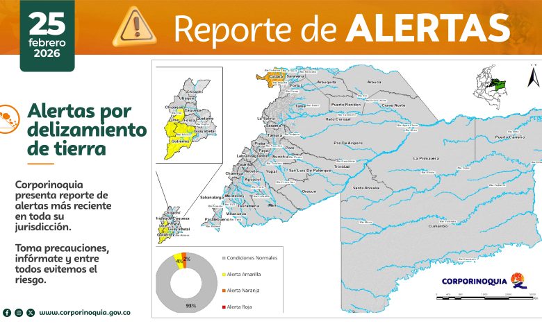 En cuanto a deslizamientos de tierra, se registra alerta naranja en el 2% del territorio, en el municipio de Cubará, en el departamento de Boyacá. Esta condición indica la presencia de factores que podrían favorecer la ocurrencia de movimientos en masa, por lo que se recomienda mantener vigilancia y preparación ante posibles cambios.