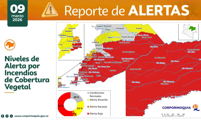 En relación con los incendios de cobertura vegetal, se registra alerta roja en el 53% del territorio, nivel que representa alta probabilidad de ocurrencia y propagación del fuego. Esta condición, se presenta en los municipios de Guayabetal y Paratebueno, en el departamento de Cundinamarca; Villanueva, Sabanalarga, Tauramena, Monterrey, Maní, Aguazul, Recetor, Chámeza, Yopal, Orocué, San Luis de Palenque, Nunchía, Trinidad, Paz de Ariporo y Hato Corozal, en el departamento de Casanare; La Primavera, Cumaribo, Santa Rosalía y Puerto Carreño, en el departamento del Vichada; Cravo Norte, en Arauca; y Paya, en Boyacá.