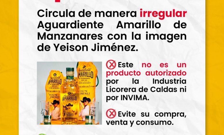 La Secretaría de Hacienda de Casanare hace un llamado urgente a la comunidad para que denuncie cualquier caso de comercialización de Aguardiente Amarillo que utilice la imagen del fallecido artista Yeison Jiménez, ya que se trata de un producto adulterado e ilegal.