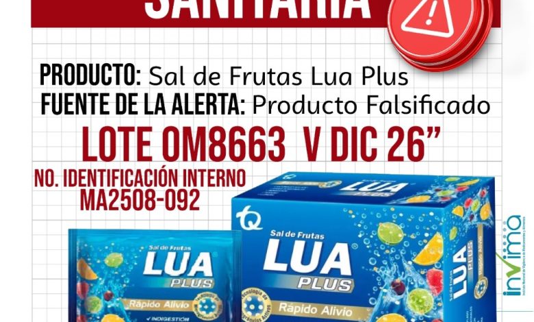 La Secretaría de Salud de Casanare informa a la ciudadanía que el Invima emitió una alerta sanitaria por la comercialización fraudulenta en Colombia de un producto falsificado identificado como “SAL DE FRUTAS LUA PLUS LOTE 0M8663 V DIC 26”. El reporte fue confirmado por el titular del registro sanitario, Laboratorio Tecnofar TQ S. A. S., ante la autoridad nacional.