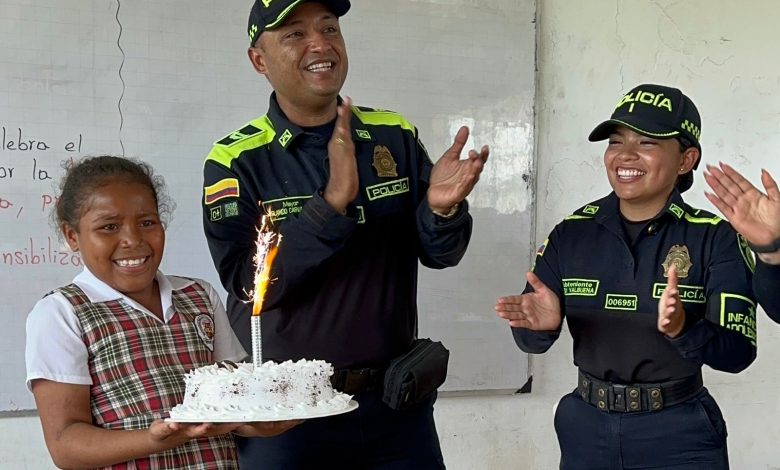 Sorpresa en aula de Mampuján: policías le llevan torta a una niña en su cumpleaños